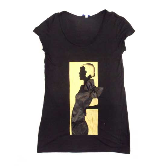 Featured is a feminine T-shirt with a cap-sleeve style. The classy silhouette print is accented with a bowknot embellishment for a touch of uniqueness. Add this trendy T-shirt to your summer wardrobe.