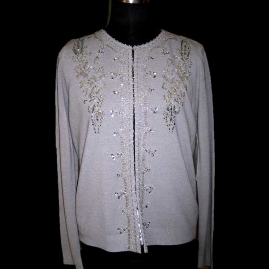 Showcased is an elegant cardigan with a round neck. The front is embellished with scattered sequins to shimmer along the neck and closure. Make an eye-catching entrance to air-conditioned areas in this beautiful cardigan.