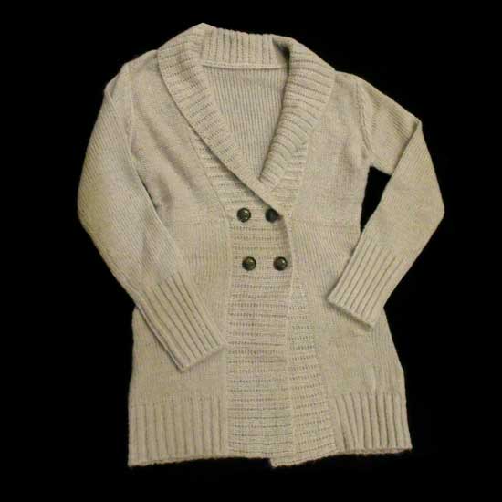 This ladies' cardigan comes with a flap-down collar in striped style. It features gathered cuffs for a neat touch. The double-breasted design displays extra uniqueness. Add this graceful item to your winter wardrobe.