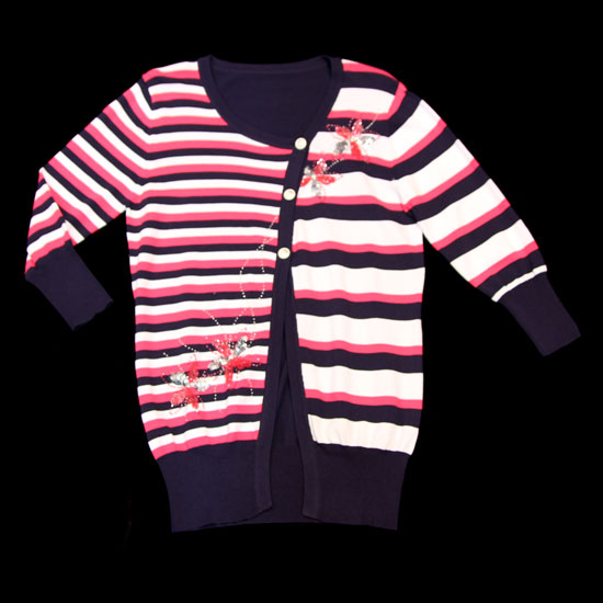 This is a pretty cardigan that is designed for ladies. It is well blended with viscose and nylon, allowing a soft and comfortable touch. The asymmetric striped patterns add a sophisticated touch to the cardigan.