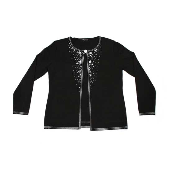 This ladies’ cardigan comes in stylish black with delicate white trim. The glittering beads at the collar and placket jazz up the appearance with a feminine touch. This beautiful cardigan is finished with only one button at the top to convey a casual yet stylish look.