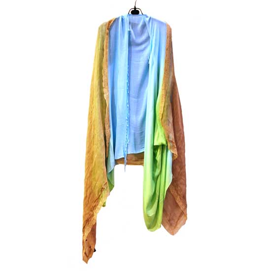 This ladies cardigan spotlights long-draped sleeves dyed in green, blue and beige colors. The ultra soft cardigan is made from rayon and linen fabric. The chic cardigan is perfect to complete your weekend casual look.