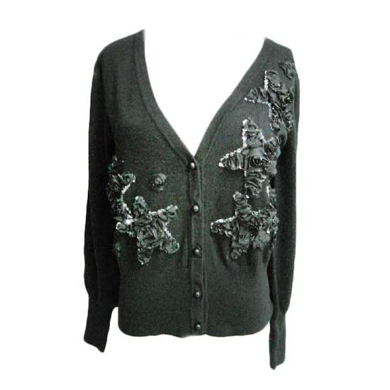 This is a ladies’ cardigan sweater featuring a low sweetheart neckline. It has a five-button closure front and long sleeves. The start-shaped ornaments with refined details add a decorative touch to the whole piece.