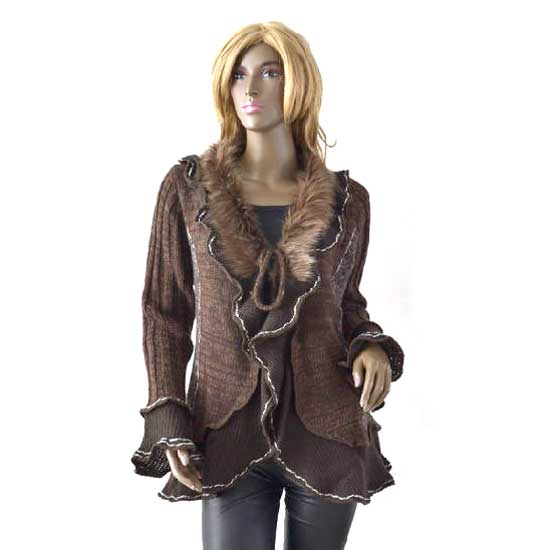 This is a ladies’ cardigan with a stylish and elegant design. The collar is made with real fur for a luxurious touch. This ladies’ cardigan comes with ruffle details for a fashionable look.