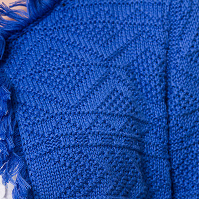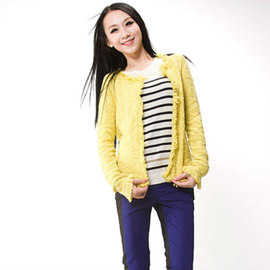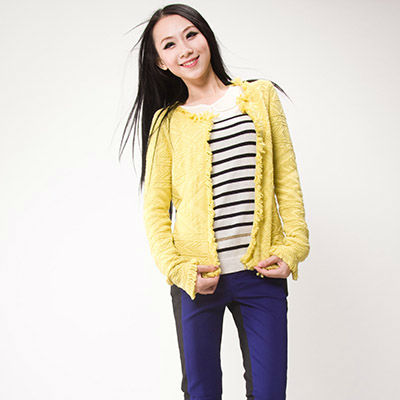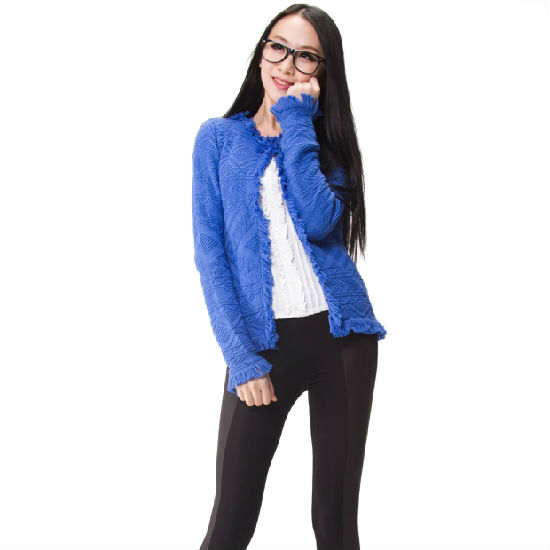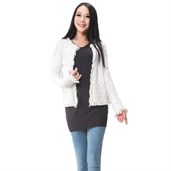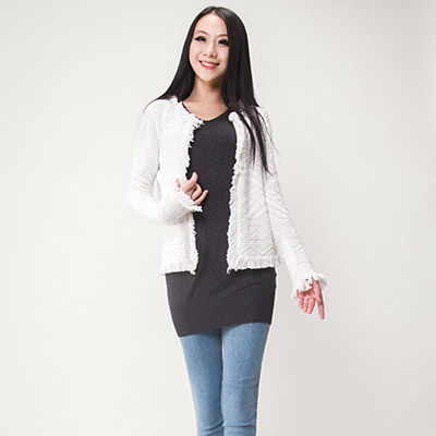 Ladies' knitted crew neck long sleeves cardigan with fringe on cuff, hem, neck & placket.