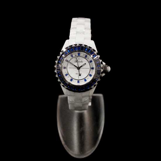 This is a ladies' watch with a chic and dainty design. The round case with an indented side is adorned with blue CZ stones. The dial is also crafted with blue and white stones for added uniqueness.