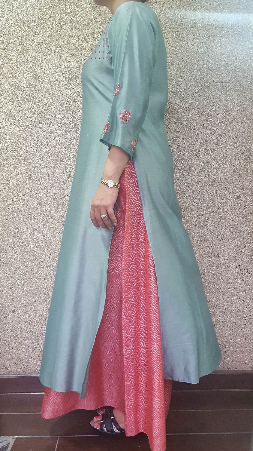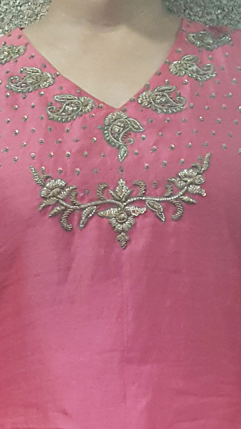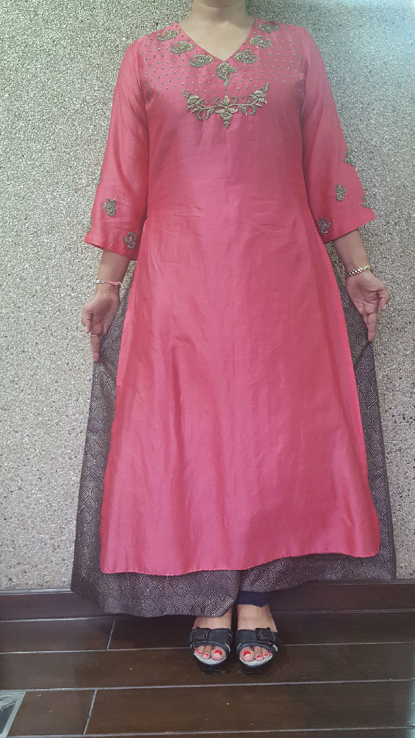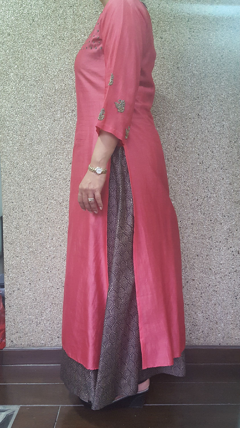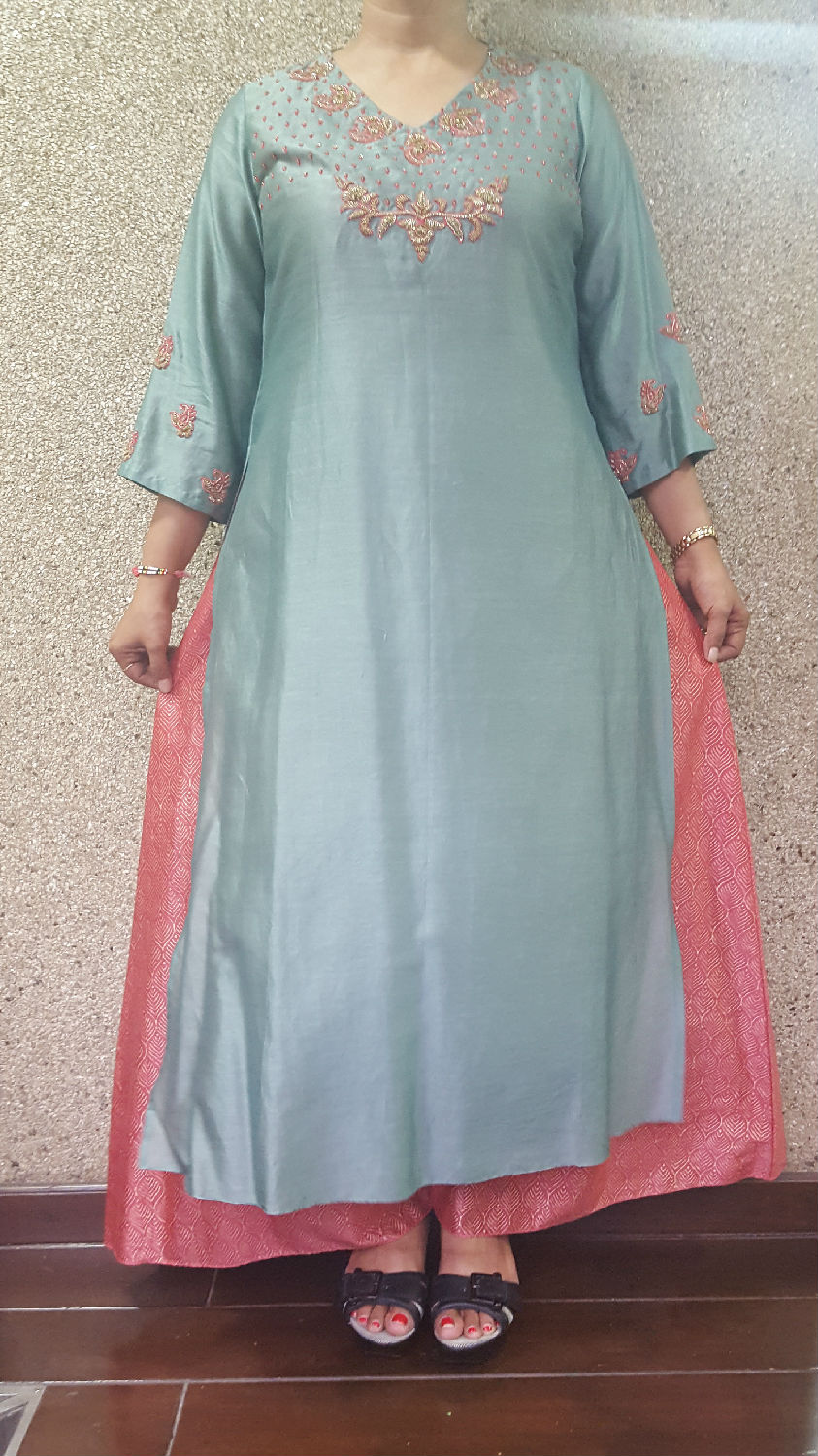 Chanderi Zardozi hand-embroidered two-piece kurta. The slip is sleeveless done with khadi print made in contrasting colours. This fabric is a combination of cotton and silk threads. This dress can be made in any size or available colour.