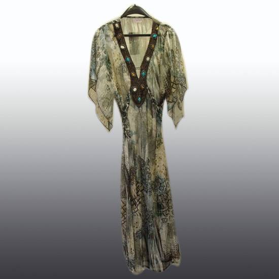 This stylish dress comes in a mid length, which falls below the knees. The deep V-neck features beautiful embellishment in different colors. The allover see-through fabric boasts unique patterns. The batwing sleeves showcase a touch of elegance. This gorgeous dress is the perfect addition to your fashion wardrobe.