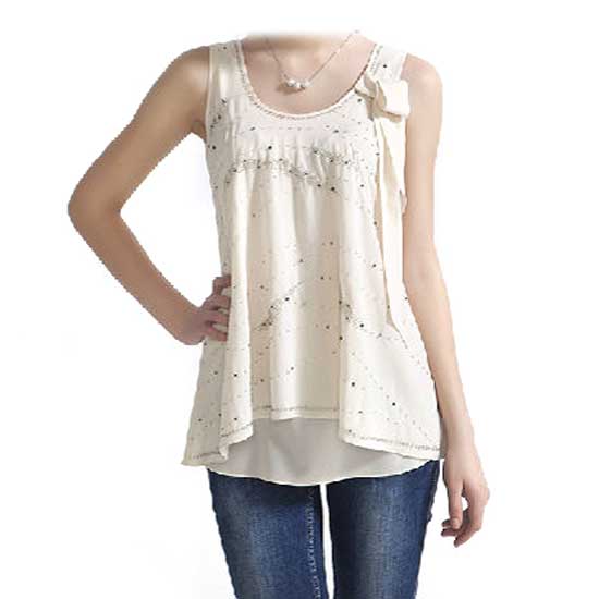 This is a ladies' tank top with an elegant and chic design in white. It is meticulously decorated with various bead elements for added uniqueness. This beautiful top matches with jeans perfectly for a trendy casual look.