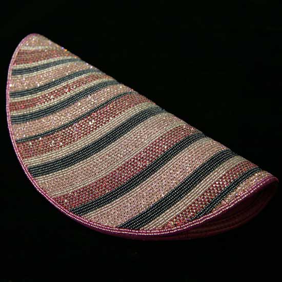 This ladies’ clutch bag is designed in a unique half-moon shape. The cover features striped patterns paved by shiny stones. The unique color combination looks glamorous for a party look.