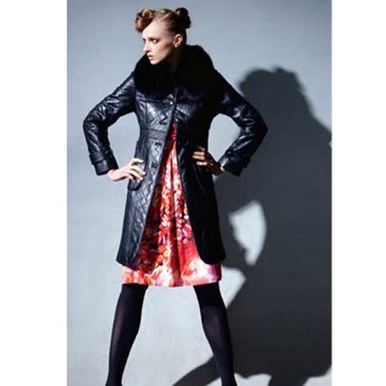 This ladies' coat features a luxurious fur collar in mysterious black. The coat exhibits a slim design with a straight cutting. With a sleek bodice, this uniquely designed coat simply makes the wearer smart.