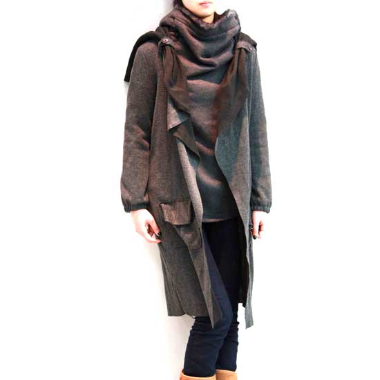 As shown is a knee-length ladies' coat utterly made of cotton. Its collars are grasped by two buttoned tabs respectively. This stylish coat can accessorize inner wear while offering coziness and warmth.