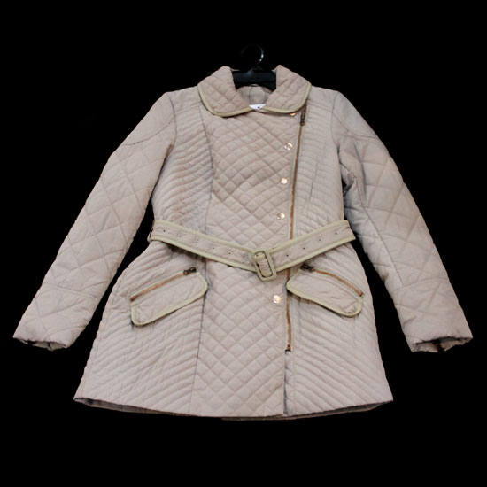 This off-white ladies’ coat features padded patterns all over for a touch of uniqueness. The coat is designed with two pockets for added functionality and a belt for extra style. This beautiful outwear is finished an off-center zipper and button closure.