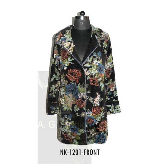 This is a ladies' coat that is made of 100% cotton velvet for enhanced comfort and softness. This gorgeous coat is printed with allover charming floral patterns for a sense of elegance. The long sleeves and notch collar highlight this stylish ladies' coat.