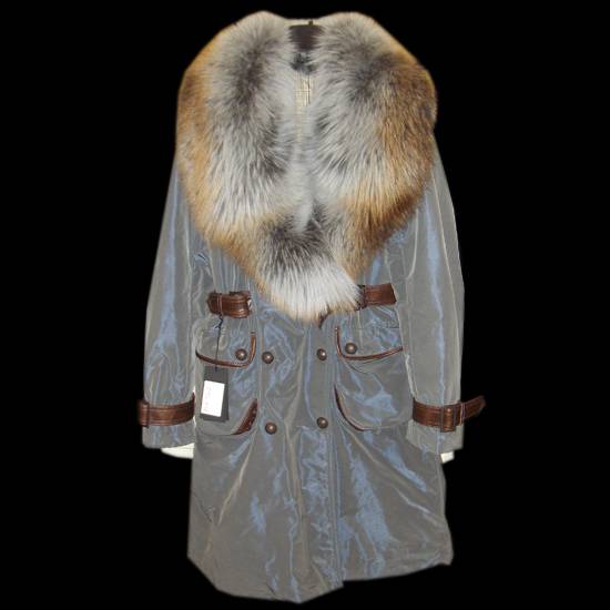 This double breast coat is featured with the shiny surface, fox fur collar and the leather trimming.