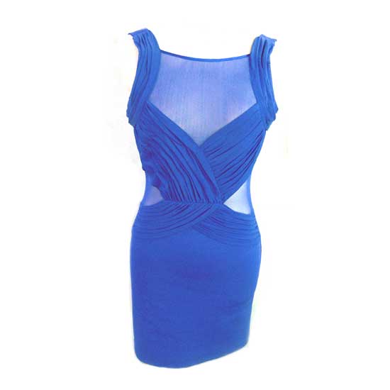 Displayed is a ladies' cocktail dress that comes in a charming ocean blue color. Featuring net fabric and pleats, this close-fitting dress looks sexy and shows body curves well. This beautiful ladies' cocktail dress is ideal for parties.