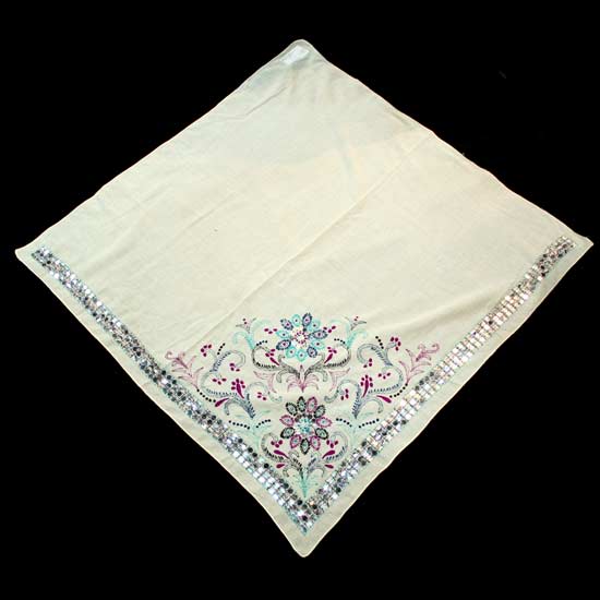 The square-shaped ladies' scarf makes a brilliant fashion statement all year round with its unpretentious and sophisticated design in white. The delicately embroidered floral patterns pair with the sparkling sequins to deliver an exotic touch. Finely made of quality cotton, this ladies' scarf promises a blissfully comfortable fit all day long.