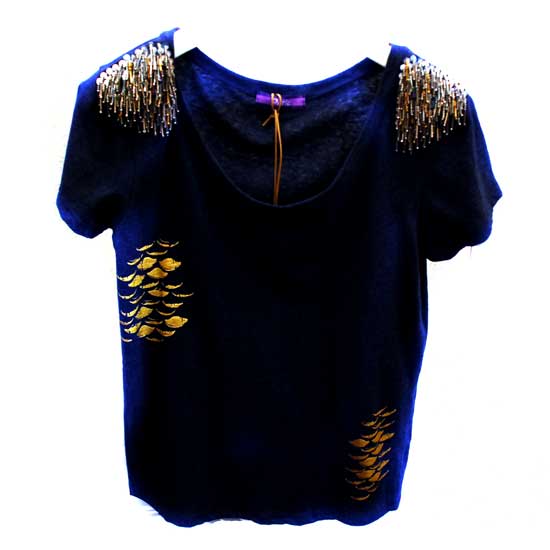 Displayed here is a ladies' top in blue. It features metallic patterns for added glamor. This cotton top is a great choice of casual wear.
