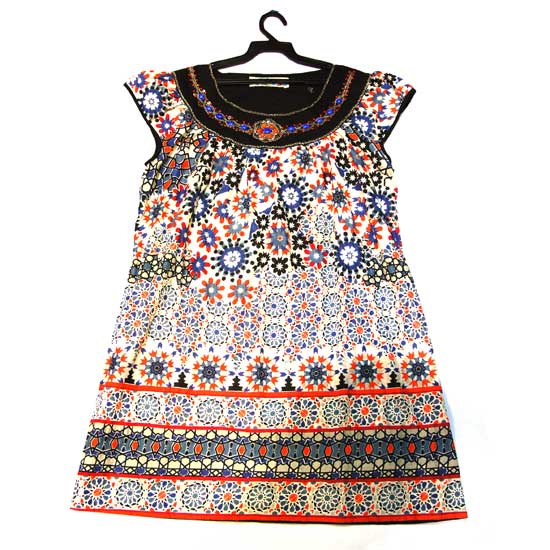This ladies' tunic features colorful floral patterns printed all over to deliver an exotic touch. The U-neckline is embellished with embroidery. The cap-sleeve design of this tunic can better showcase the arms of the wearer. Complete your wardrobe with this nicely designed tunic.