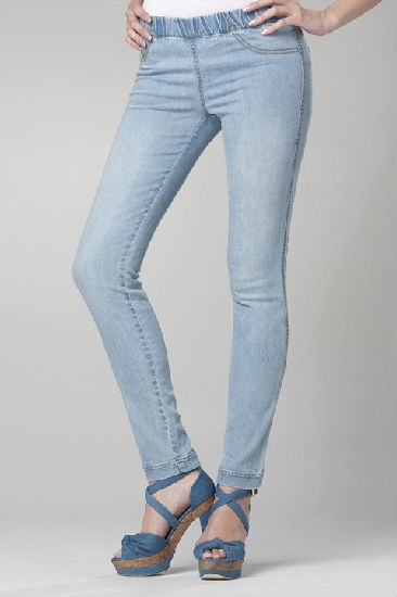 These light wash denim leggings feature an elastic waistband with meticulous detailing includes faux front pockets and fly, and whiskered hamstrings and knees.