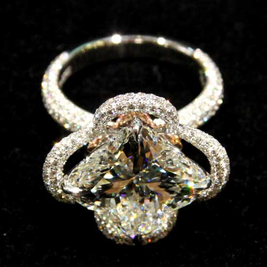This stylish ring features a dazzling silver construction. It boasts a sparkling lily-cut diamond in the center, showcasing a touch of sophistication. This eye-catching ring is suitable for special occasions.