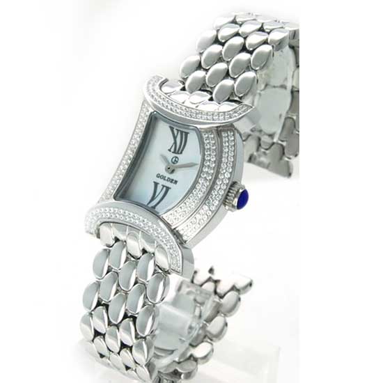 Showcased is a gorgeous watch featuring sparkling diamonds on the case. The case is designed in a unique curvy shape to match with the simple black-and-white dial. The chain strap comes with a shiny touch for enhanced beauty.