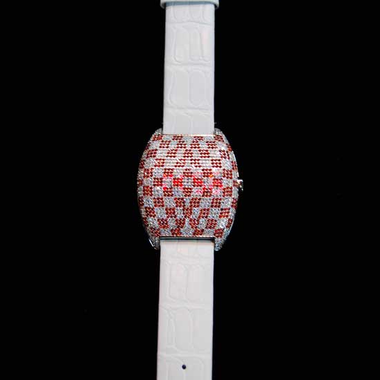 This ladies' digital watch features a classy design. The case and dial are fully set with diamonds and color stones in red for a luxurious style. The elegant leather strap offers exceptional wearing comfort.