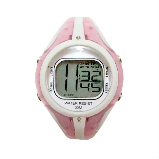 This fancy digital watch features a girlish design in pink and white to delight female users. It features a lightweight plastic construction that ensures wearers' comfort. The water-resistant design makes it ideal for use in outdoor occasions too.