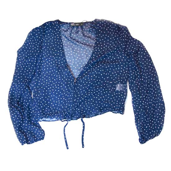 This ladies’ navy hued blouse stands out from others with the allover nice dotted patterns. The ruched hem with a drawstring adds a cute accent easily. This fascinating blouse is made of polyester.