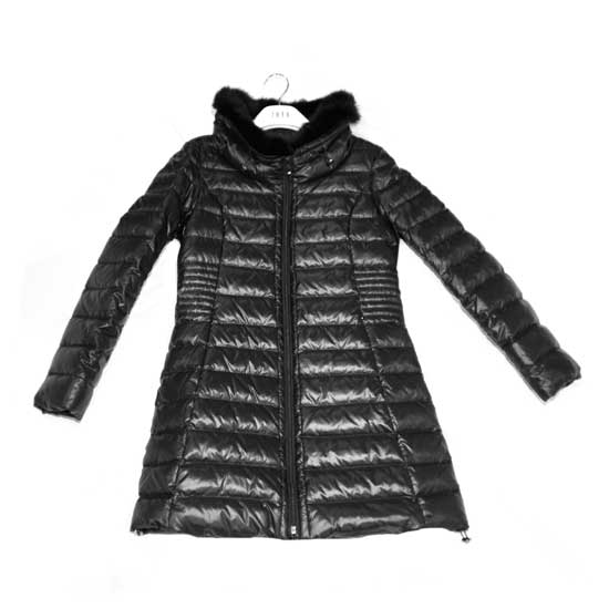 This ladies’ down coat with a padded design features a glossy black toned appearance for a fashionable look. It is fitted with a hood with furry details for added warmth. This snug down coat is finished with a black zipper closure.