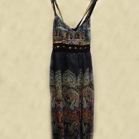 Featured is a sleeveless dress in an empire waist and deep V-neck design. The spaghetti straps and fitted bodice showcase the lady's alluring body figure. The colorful allover geometric patterns unleash a sense of exoticism, making it a unique piece to your wardrobe in summer.