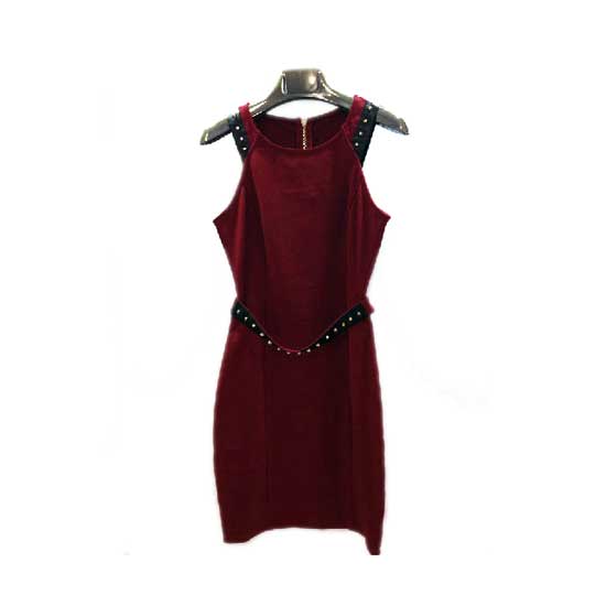 This ladies’ sleeveless dress features a deep ruby color for an elegant look. The metallic decorations near the neck and at the belt bring a fashionable element to the design. This well-tailored one-piece dress pairs well with high heels.