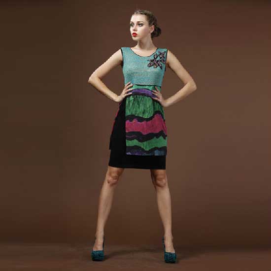 This ladies' one-piece dress features comfortable styling and a bold brightly-colored print. The black fabric trimming on the collar, hems and skirt showcases a striking effect to its appearance. The above-knee length makes it a sexy yet decent fashion addition to your wardrobe.