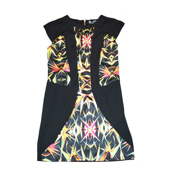 This ladies’ dress features black and vibrant abstract patterns alternating with each other. It comes with a round neck and a sleeveless design. This stylish one-piece dress is a great complement to your elegant look.