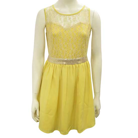 This elegant ladies’ dress in brisk yellow is a lovely piece for wear on summer days. The well-tailored bodice comes with a sweetheart design with lace details. The golden-hued sequin band at the waist highlights the look.