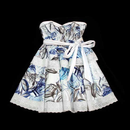 Displayed is a ladies' dress that comes in a refreshing blue-and-white printed pattern. Made of 100% cotton, this dress is soft and breathable, making it suitable for long time wearing. This pretty ladies' dress is perfect for a sunny summer day!