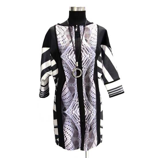 This ladies’ dress is made of satin for a classy shiny sheen. It features contrasting patterns for a unique visual effect. The zipper closure at the front makes it easy to put on.