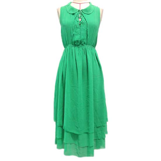 Displayed is a ladies' dress that comes in a refreshing green color. Featuring a collared neckline and a sleeveless design, this dress is full length with a tiered skirt. This elegant piece is a fashionable choice for you.