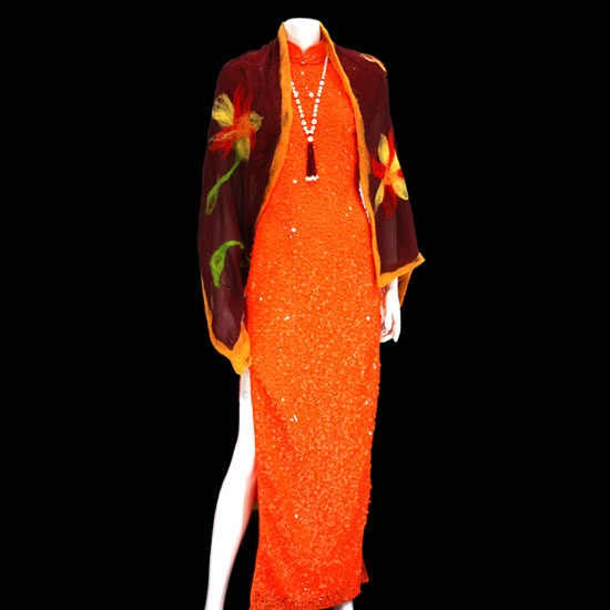 This is a Chinese cheongsam that is ideal for fashionable ladies. This ladies’ dress is designed in bright orange and with delicate patterns for an eye-catching look. Featuring a slim-fit design, it showcases your alluring silhouette nicely.