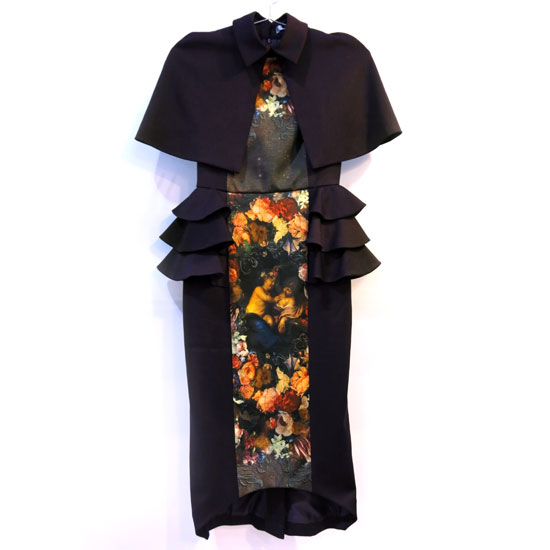 This dress appeals to people with its noble, fashionable and elegant appearance. It features a cloak top and three layers on the skirt for added uniqueness. The colorful floral patterns highlight this dress for a touch of charm.