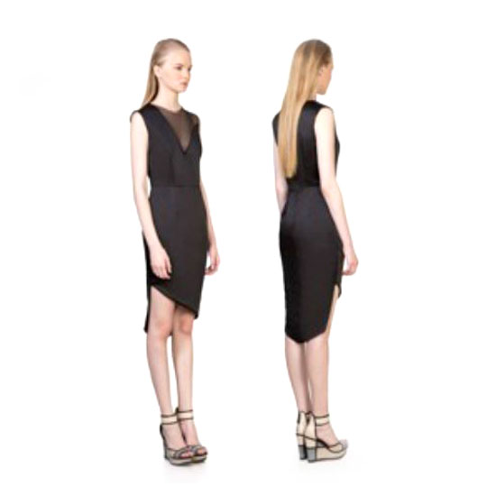 This is a sleeveless tulle dress coming with a V-neck cut-out design and a black mesh. It looks even more gorgeous with an asymmetric hem. This bodycon dress shows your body curves and goes perfectly with peep-toe pumps and clutches.