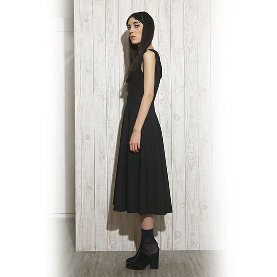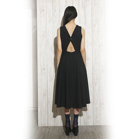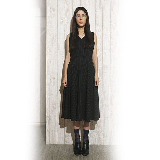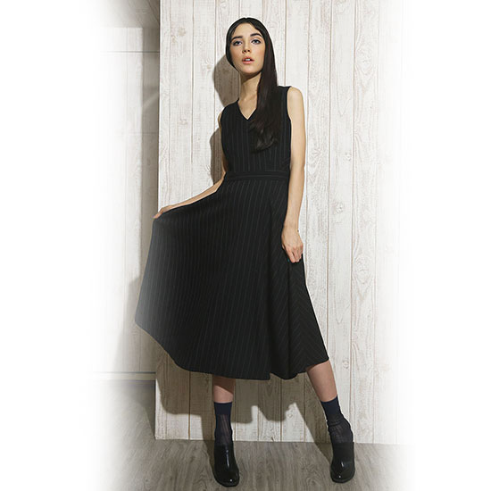 This is a ladies’ one-piece dress that comes in allover black for modern elegance. It is designed with a classic V-neckline, a slim-fit bodice and a pleated skirt. This sleeveless dress is an ideal addition to complete your wardrobe.