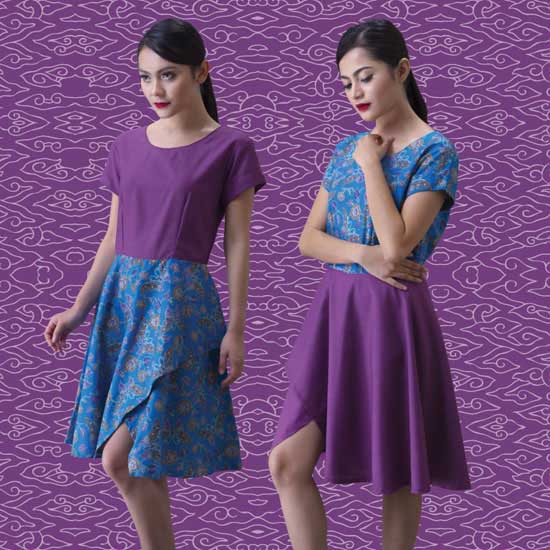 This ladies' dress features a purple top and a light blue skirt. The skirt is embellished with Cirebon batik prints for a folk style. The short sleeves and round neck make it ideal to wear in summer and autumn.