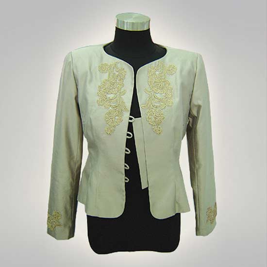 The ladies' long-sleeve jacket boasts embroidery on the bodice and cuffs to showcase an Asian touch. It comes with a concealed toggle closure. This ladies' embroidered jacket is a sophisticated item for formal occasions.