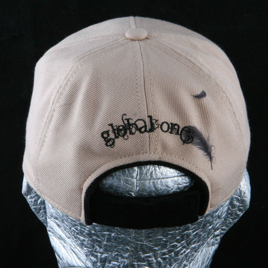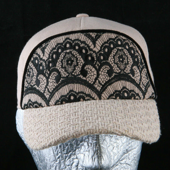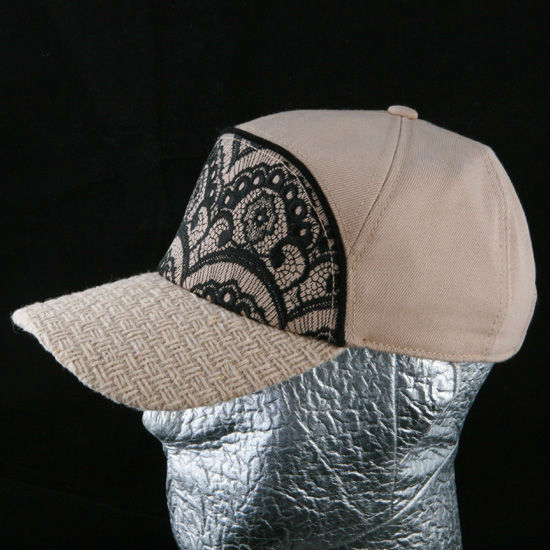- Curved brim with woven texture.