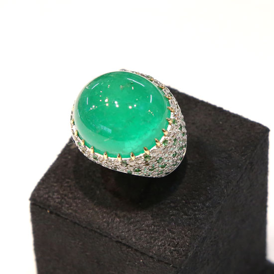 This chunky emerald ring features a domed emerald with a high-gloss finish. The emerald exhibits a seafoam green color with great transparency. Embellished with finely-cut diamonds, this ring looks even more gorgeous and appealing.