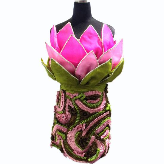 This ladies' evening dress comes with natural colors. The lower part features ruffled woven fabric in pink, green and brown. The upper part resembles an eye-catching lotus with silvery trim.