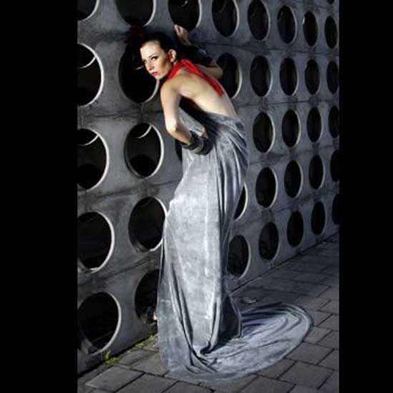 This evening dress boasts a sexy low cut at the back. The halter-neck front is highlighted by sharp red straps. The bottom features a loose and spreading cut to express a unique design.
