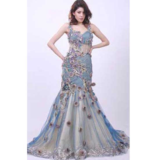 The ladies' evening dress features a halterneck top and a transparent waist. The floral embroidery throughout adds a decorative touch. Look charming in this gorgeous dress at parties, weddings and banquets.
