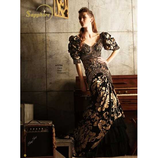 This gorgeous evening dress features a V neckline and puffy sleeves for added style. Unrivalled black and golden tone design shed a luxurious accent. This florid evening dress is sure to make you outstanding in the party.